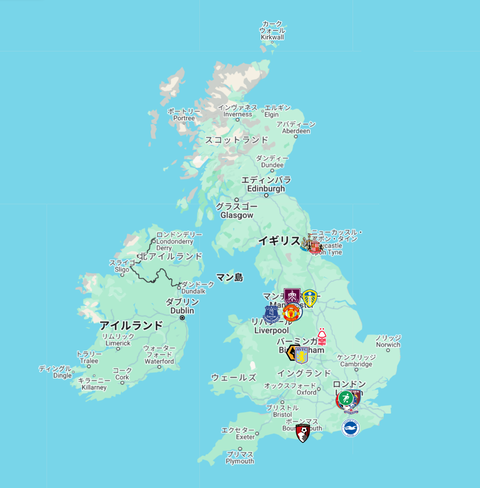 2024/25シーズンのプレミアリーグの地図です。Googleマップに飛びます。マーカーの位置はホームスタジアム…