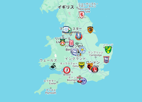 2024/25シーズンのEFL Championship(2部相当)の地図です。Googleマップに飛びます。マーカーの位置はホー…